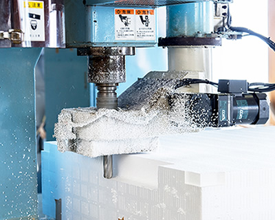 発泡スチロールの金型模型製作は工作機械で行います。その機械をどんなスピードで、どうやって動かすのか。そういった命令を、すべてプログラムされたものが「NCデータ」です。当社では熟練したエンジニアが、先述の3D CAD/CAMデータをもとに「NCデータ」を製作するので、正確で、迅速かつスピーディー。機械を無駄なく効率的に動かし、スムーズな製品製作を実現しています。
